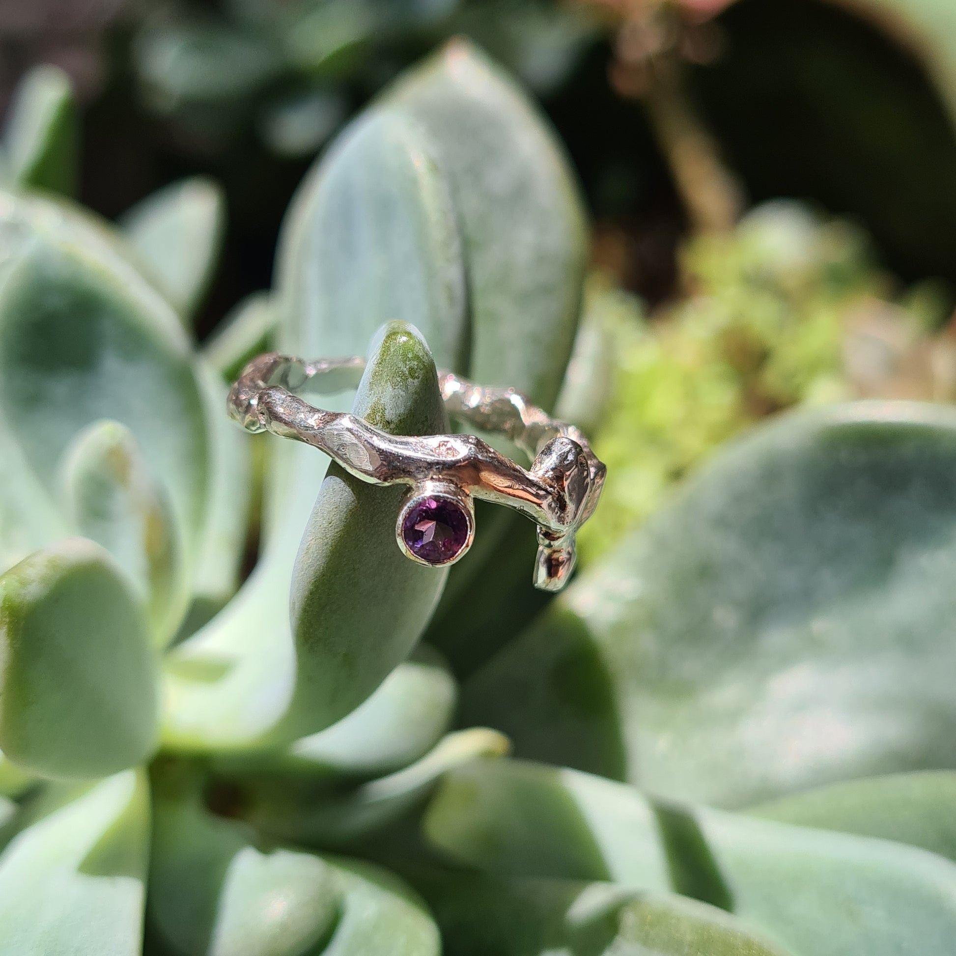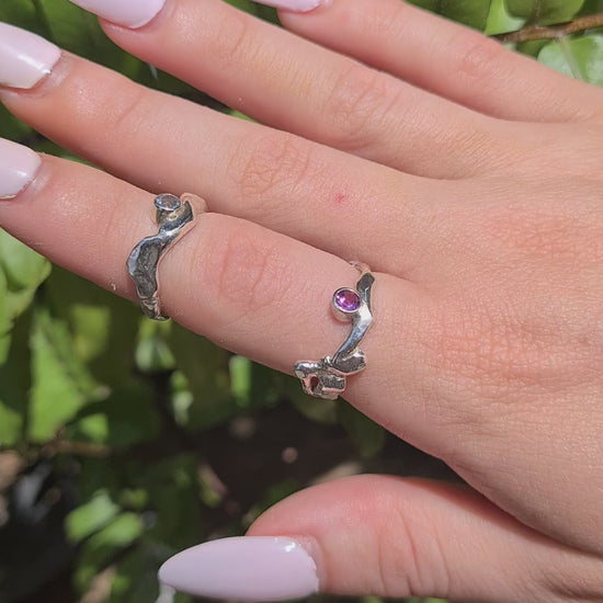 Crafted from reclaimed sterling silver offcuts, this distinctive molten ring showcases the raw beauty of sustainable metalwork. Each piece captures the organic fluidity of hand-worked silver, creating a uniquely textured surface that catches light beautifully. Set with a genuine amethyst gemstone, the purple hue adds a sophisticated focal point to the irregular form. Perfect for those who appreciate artisanal jewellery with character and environmental consciousness.