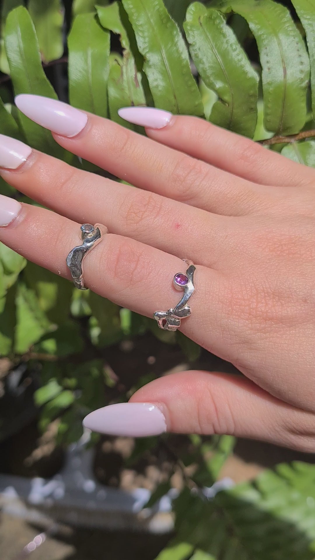 Crafted from recycled sterling silver, this distinctive molten ring showcases organic, fluid forms that catch light beautifully. The captivating blue topaz stone adds a sophisticated pop of colour, while the hand-forged design ensures each piece is entirely unique. Perfect for those who appreciate artisanal jewellery with environmental consciousness and individual character.